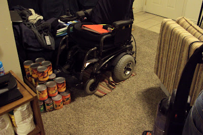 We moved the wheelchair against the black couch and moved canned food (which we normally store under the couch!)